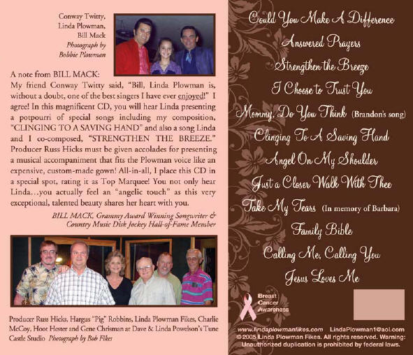 Linda recently recorded a Country-Gospel CD in Nashville with Russ Hicks as producer, featuring some of Nashville's most gifted musicians: Russ Hicks - steel & dobro; Charlie McCoy - harmonica & bass; Hargus "Pig" Robbins - piano; Hoot Hester - fiddle, mandolin, acoustic guitar; Gene Chrisman - drums. It has a mixture of some old favorites and some original songs that were prayerfully selected over the past few years.